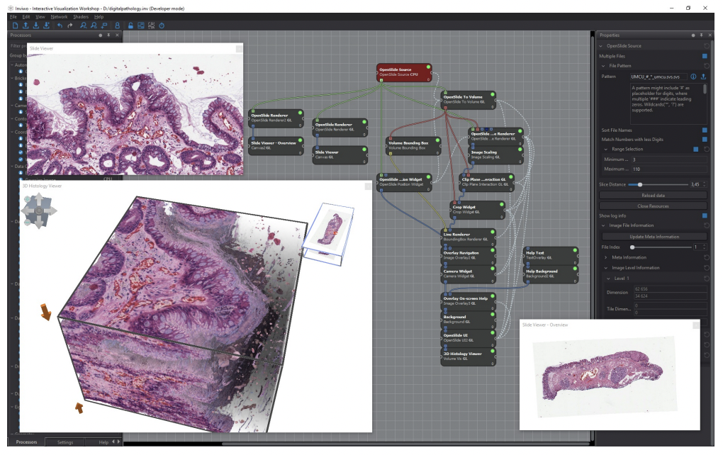 Inviwo: Inviwo is essentially a computing platform interoperable visualization system with usage abstraction levels through a layered architecture. The proposed platform allows algorithms developed for different computing platforms to be used together while still allowing developers to access the underlying computing platforms. The below figure shows an interactive rendering of 100 slide images as well as domain specific navigation. It features details like individual nuclei (spatial pathology?). The visualization of the image stack is based on brick-based volume raycasting, thus enabling large scale data handling of volumetric data within Inviwo.