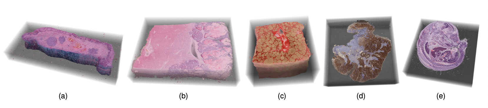 (a) Barrett’s esophagus, H&E stain. (b) healthy liver, H&E stain. (c) liver cirrhosis, Sirius red stain. (d) colorectal adenocarcinoma, immunostaining. (e) mouse embryo, H&E stain