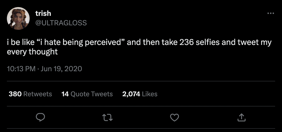 When we become worried about our image, we start to question – did I look cool enough to X person from a certain facet of my life, while also nonchalant enough to Y person from a different aspect of my life? We become uneasy about being perceived as just another person. We all want to be special and different and portray to have these great wonderful lives that are better than the people we compare ourselves to, people we secretly want to be like. This fills the anxious void in the moment, but if we aren’t being real, are we real? We begin to question the veracity of our portrayal. But it turns out, existing means being perceived, in all its forms. And we can be seen right through the portrayal.