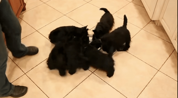 Every individual starts pushing in one-direction. What happens is a pinwheel – an emergent property of the interactions between puppies. Their only rule is to try to keep access to the milk, and therefore, to push in a random direction.